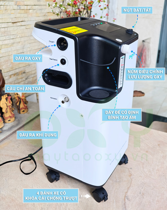 - Lưu lượng oxy 0,5-5 lít/phút, độ tinh khiết của oxy đạt 96%. Sản phẩm chất lượng tốt, đảm báo đáp ứng được nhu cầu của người sử dụng, lượng oxy đều đặn.